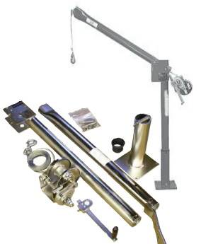 吊臂绞车,该款绞车包含一个203mm×203mm的底座和一个914mm长的吊臂,高度为1626mm。吊臂可360°旋转,负载可达225kg,可装载76米长的3mm钢缆。标配含15m长的5mm钢缆。